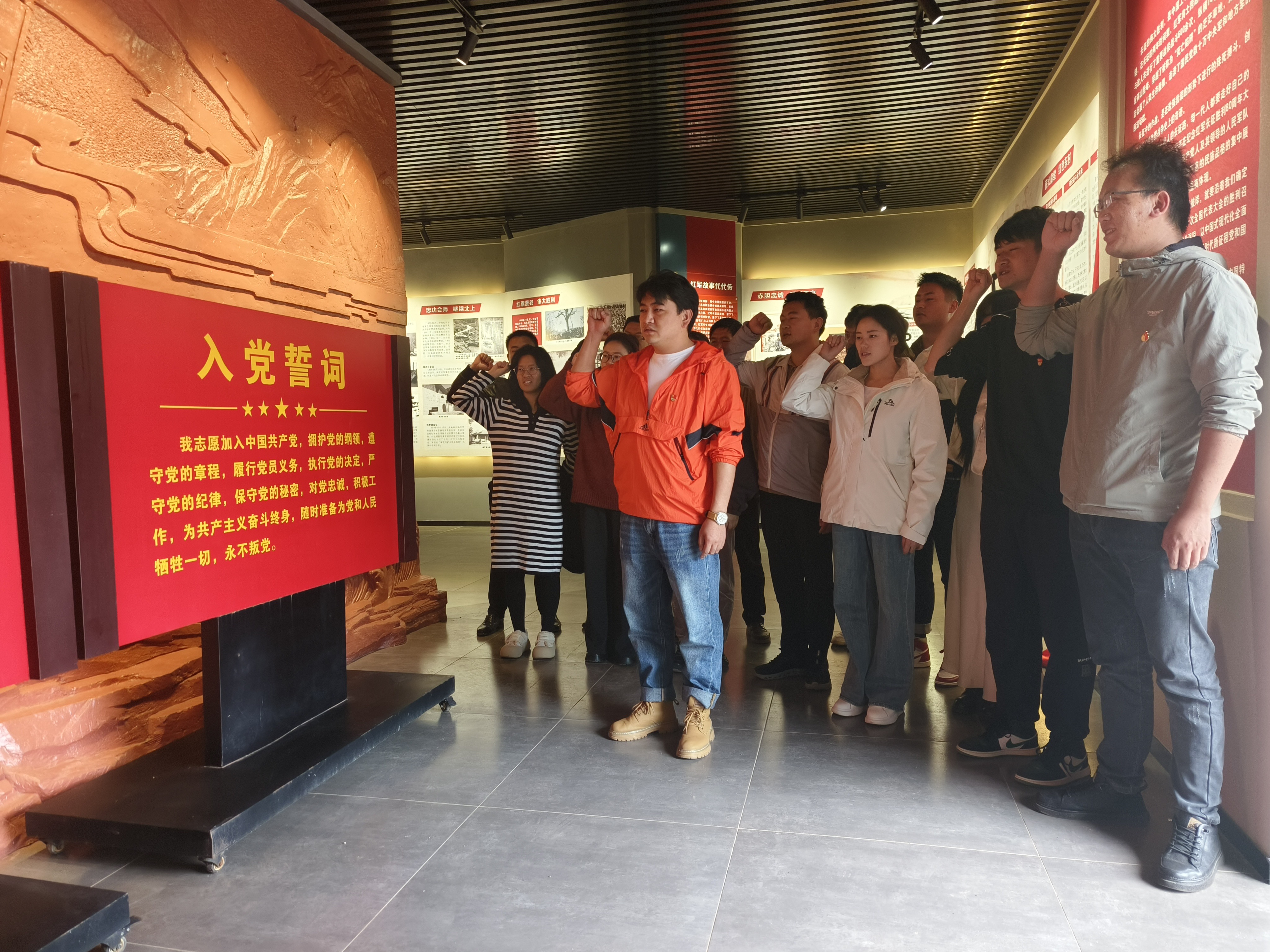 在庄严肃穆的党旗前,全体党员紧握右拳、神情庄重,重温入党誓词。誓言铿锵有力,既是对初心使命的重申,也是对接续奋斗的承诺。