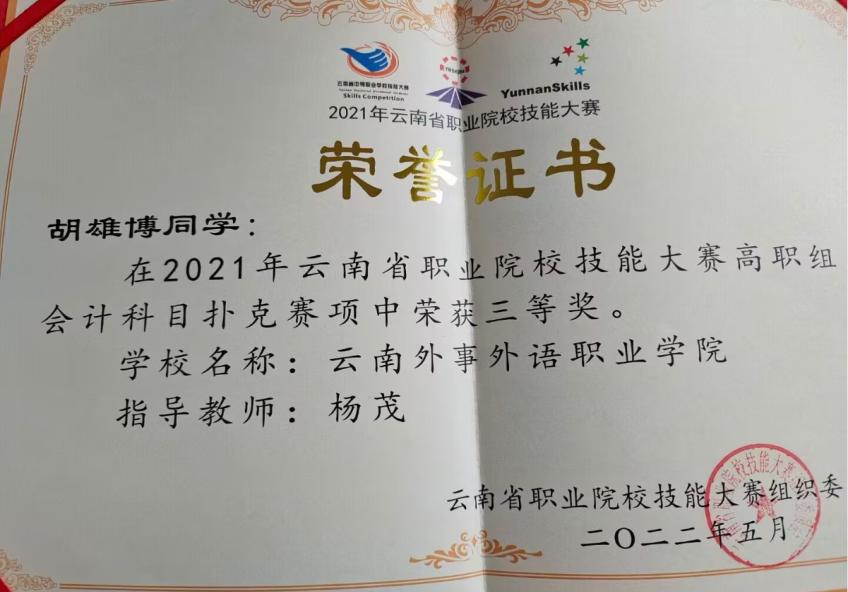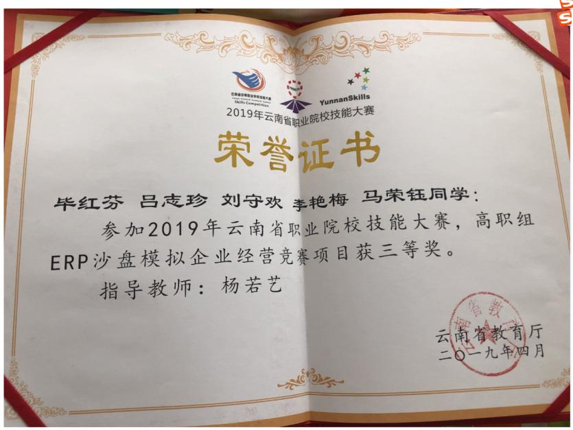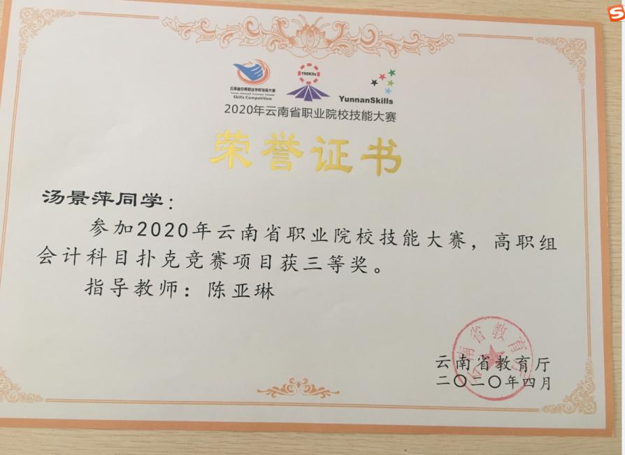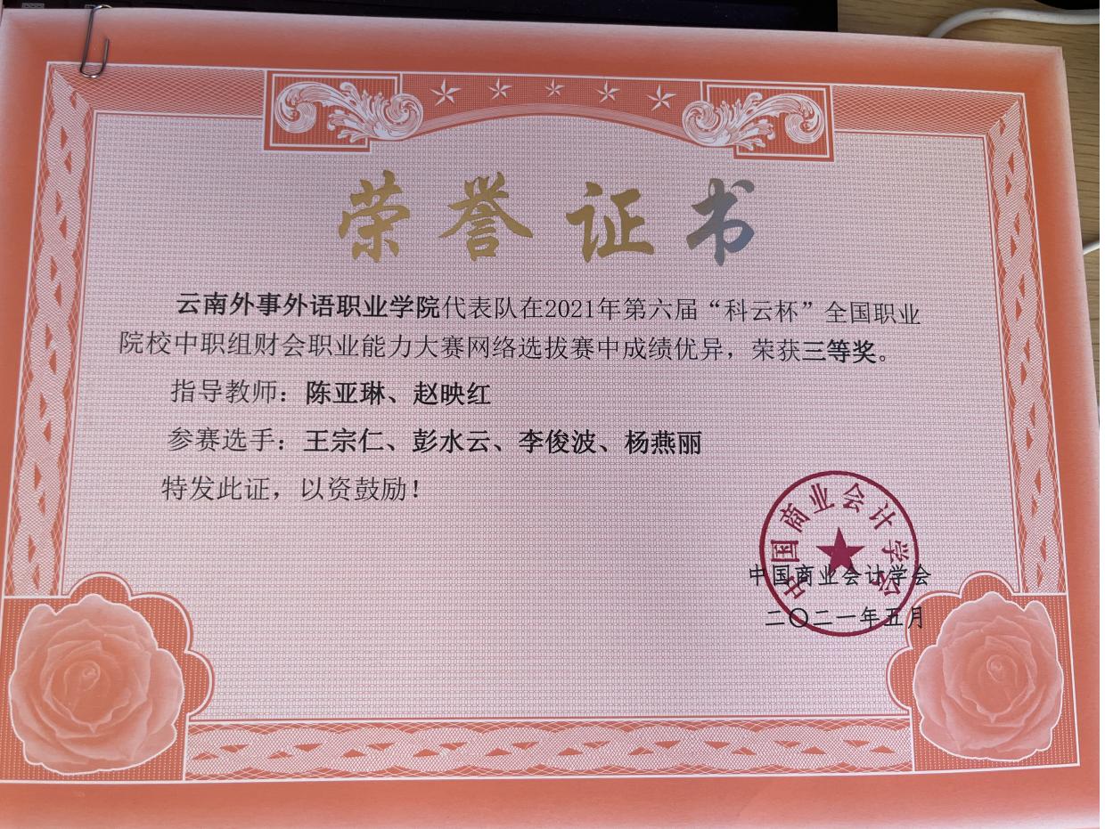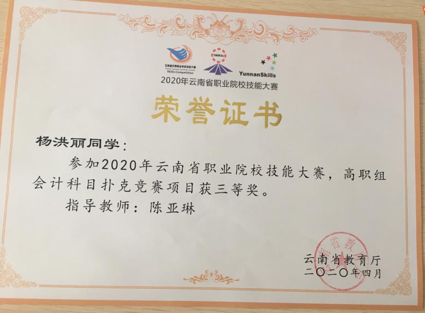 2020年云南省“衡信杯”高职院校财税技能大赛高职组三等奖。